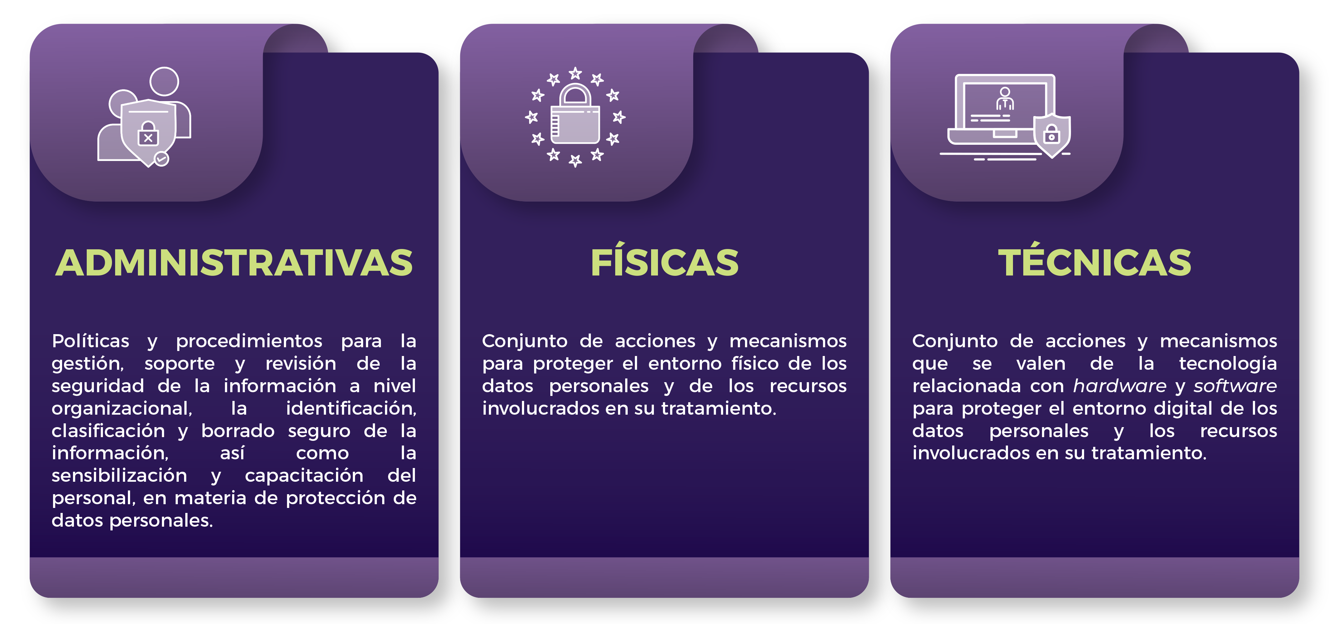 Tales medidas van desde disposiciones, garantías y sanciones jurídicas, hasta de naturaleza técnica como respaldos, claves y contraseñas, uso de equipos de cómputo ad hoc, y reglas internas de designación de responsables y usuarios de las bases de datos, horarios de uso, entre muchas otras.